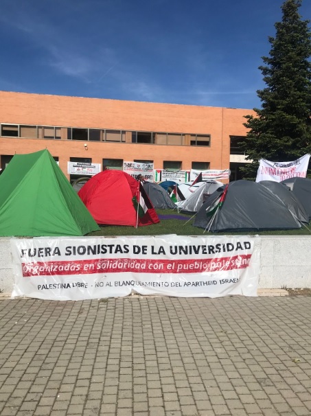 Fuente: © 2024 RAAU. 8 de mayo de 2024. Universidad Complutense de Madrid. Pancartas con el mismo lema se encontraron en la Universidad Rey Juan Carlos en febrero de 2024 y en otras acampadas universitarias.